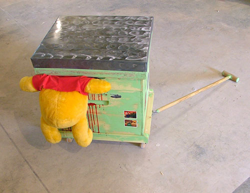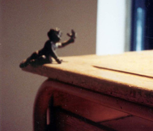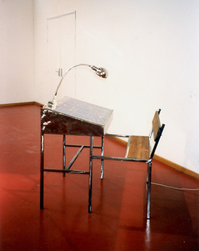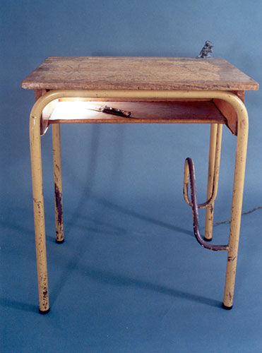 Cette injonction nerveuse à l'accent que l'on devine particulier, utilisée par une artiste lilloise pour définir une oeuvre, illustre les prolongations d'un défi comme ce rayon de lumière tombant sur la lame d'un couteau à cran d'arrêt placé sous l'étagère inférieure d'un bureau d'écolier. Bien utilisée à s'autofustiger, la violence a trouvé son maître.