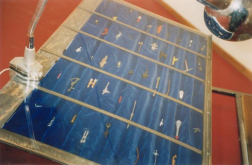 Pupitre , bois, métal, feutre bleu, miniatures d’armes (matériaux divers),
