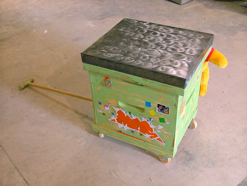 tatoos, insigne, vernis, roulettes et manche en bois.