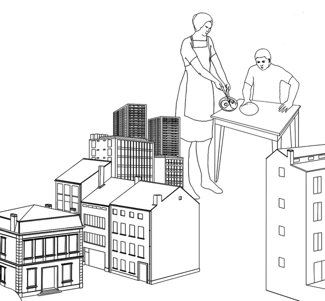 De ce constat, j’ai construit Désirs, entreprises, un panorama avec la volonté simple de réintroduire les habitants au cœur du dessin. Ceux-ci fonctionnent comme des charnières au sein de ce mural qui se déploie tel un paravent où sont articulées différentes typologies de bâti. Du construit: maison bourgeoise, immeubles, maisons d’ouvriers, usines, tours - liés par différentes situations: de l’intime au domestique, du travail au désœuvrement. Stéréotypes ou imagerie, les figures pointent certains rapports à la cité, où l’habiter et la nécessité des échanges se côtoient dans une idée de l’urbain mise en perspective, à la fois décor et terrain actif des activités humaines. |