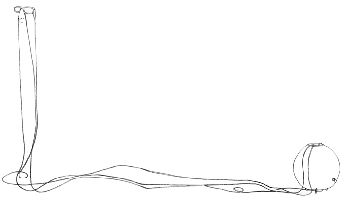 Nommé d’après l’essai de Jan Turnovsky sur la maison de Ludwig Wittgenstein, The Poetics of a Wall Projection, ainsi qu’en référence à son propre mode de fabrication (le dessin est projeté au mur pour être reproduit), convoquant les questions sur l’espace illusioniste de la perspective posées par Daniel Buren au moyen de son “outil visuel”, ce dessin joue avec les systèmes de représentation de l’espace tridimensionnel et l’illusion (et l’efficacité) de ces systèmes. Sous ses apparences de maîtrise, cette image n’est qu’approximation, les perspectives ne se recoupent pas, les raies ne sont pas de même largeur, les traits ne sont pas verticaux, etc. prenant le contrepied des dispositifs conceptuels, ramenant du trouble dans la rigueur du procédé.