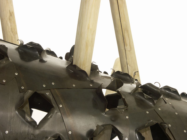 Tôle d'acier éclatée, rondins de châtaignier teints, 385 x 370 x 380 cm