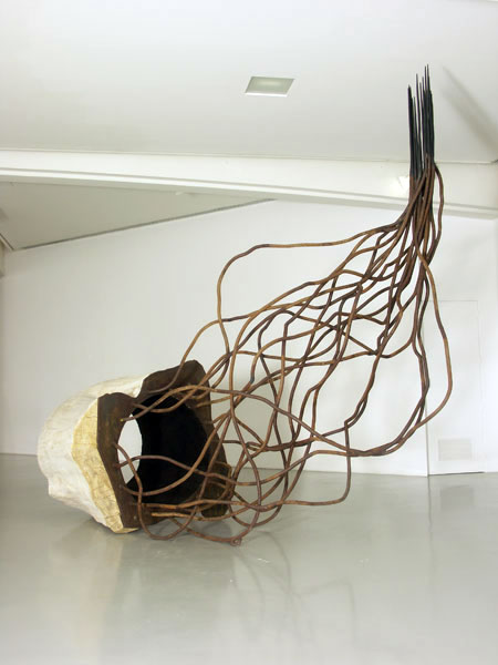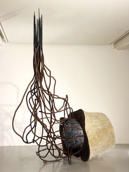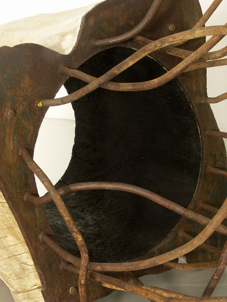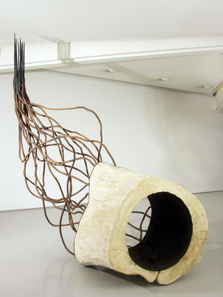 Bois de peuplier, fer rond oxydé et forgé, 385 x 350 x 185 cm