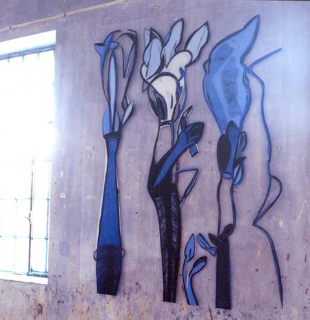 La force de ces emblèmes, costauds et trapus, dans un lieu suspendu, bleu dans la ville, traverse ses fleurs/corps, ces plantes/figures, ces ornements floraux venus historiquement de vastes histoires égyptiennes ou grecques. C’est là dans le petit iris ou la fragile giroflée, dans les fleurs exagérément féminines que je trouve la résolution du fond du problème.