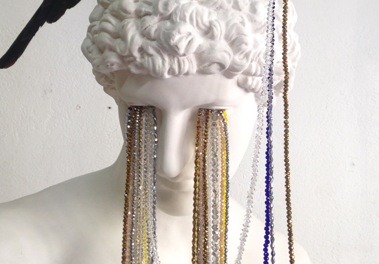 Plâtre polyester, pierres semi-précieuses, pie naturalisée