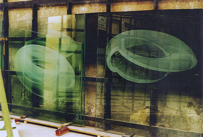 Sablage sur verre feuilleté-trempé, largeur 150 cm, hauteurs variables