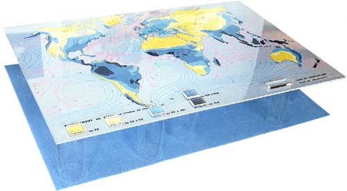 Sur cette représentation mondiale des précipitations et des courants, des légendes comme : flux de frustration, flux de jouissance, ou refoulemement de désir, en nombre de jours par an... se substituent aux légendes dorigine, introduisant une distance entre rationalité de la méthode et subjectivité des «éléments observés». Le décalage qui sopère ici, fait que des sentiments comme le désir ou la frustration deviennent matière insaisissable dune hypothétique analyse objective, scientifique et quantifiable.