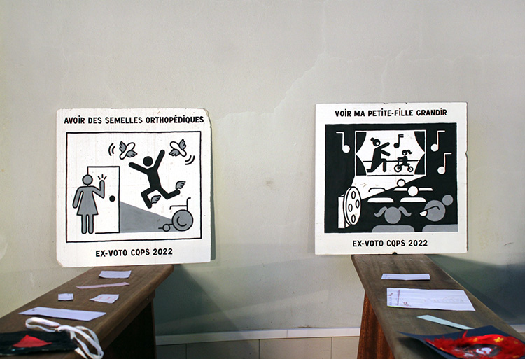 | Vue de l’exposition, détail des ex-voto Avoir des semelles orthopédiques et Voir ma petite fille grandir, 2022 |