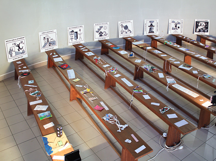 | Vue de l’exposition, détail des ex-voto Erasmus à Bruxelles, Accident à la Méouge, La Dame aux Fourchettes et Une chambre réservée là-haut, 2022 |