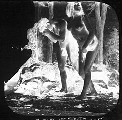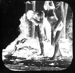 Ce lieu est un endroit de passage entre le monde des affaires et un espace de détente The Winter Garden : va-et-vient entre le monde de la finance et le jardin d’hiver, métaphore du paradis perdu. Sur les vitres des 6 portes à tambour situées au North Bridge du World Financial Center sont collées des sérigraphies détournant l’espace public en espace intime, privé. Les images créées en négatif à partir d’une photographie érotique stéréoscopique sur plaque de verre représentent une métaphore du paradis perdu. Je ne connais ni l’auteur, ni la date de prise de vue. Sur les battants de chaque porte, quatre étapes de cette série d’images sont imprimées en noir et blanc sur fond de miroir.