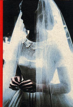 As the pages are turned, the reversed image enters into colloquy with its twin; the first time this happens, ilduo appears on the verso, the possibility fortuitous reverse of oubli. And the last time the pages are turned, the photo is flipped, terminating an internal dialogue that hadclosed on the phrase, one no longer knows if ine is lying about it. The word disparition in smaller type still, appears after an interval. Wether the mariage is understood as a betrothal to a particular man, or, only slightly less satisfactorily, as a vow of loyalty to a conventional social order, this is a book suffiently nuanced, even ambiguous, but utterly convincing. |