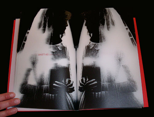 Looks how feminine roles are written, specifically the long-playing part of life.Between blood-red endpapers, the entire book is printed on milky white translucent stock, four blank pages of which introduce and conclude it. Within this dense veil, the same black and white photograph of an elelgant but anxious young bride appears on every page. Her face is turned away in shadow, and she is nervously picking her fingers, though otherwise composed. On every other page there is a single line of text, in frenc, printed in fine red letters. The first is, simply, Oubli, it means forgetting, inthe most common usage, but also neglect, oversight, omission.