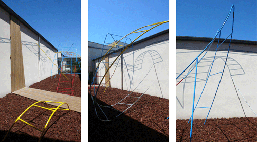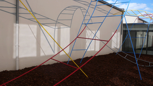 L'intervention artistique se situe dans un patio inaccessible traverssant l'école. La situation centrale de l'espace (entrée principale et passages vitrés de circulation) est soulignée par l'installation de deux pontons en bois(surélevés par des socles métalliques), offrant une circulation entre les ouvertures possibles d'un bout à l'autre de l'école et sur un autre axe.