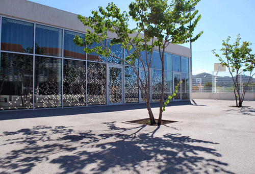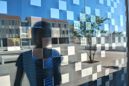 La composition de cette oeuvre en forme de puzzle lacunaire, implique un rapport à la fois actif et ludique à l'image. En se plaçant de par et d'autre de la vitre, les élèves peuvent observer leur image morcelée tout en la complétant avec celle d'un ou des élève(s) situé(s) de l'autre côté de la vitre.