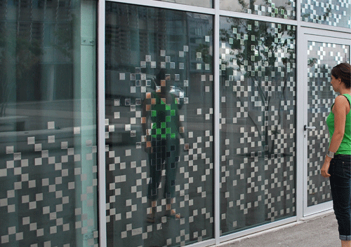 « L'oeuvre évoque un paysage pixélisé composé d'une alternance de miroirs sans tain et d'espaces vitrés. Elle propose un espace d'expérimentation posant la question de l'altérité au travers de la reconnaissance de soi, des autres et de l'environnement par un processus de déconstruction et de reconstruction de l'image. - Le miroir sans tain fonctionne en biface, sa qualité réflexive peut apparaître des deux côtés de la vitre et ce en fonction de la quantité de lumière. -