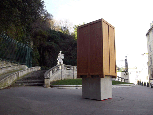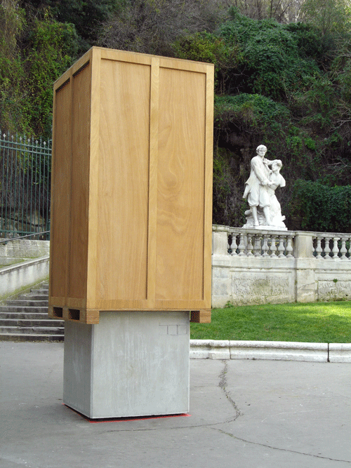 Une caisse en bois, identique à celle utilisée pour le transport des oeuvres d'art, est érigée sur un socle. Elle représente à la fois l'oeuvre enveloppée, en attente d'être installée et donc révélée mais aussi l'insaisissable de la forme, le secret, l'indéfinissable, qui caractérisent la plupart des objets d'art.
