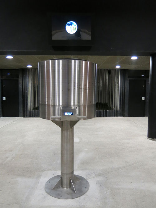 Structure inox, collecteur électrique tournant (cuivre et plastique), ordinateur, écran, connexions électriques multiples, gravure, laser.