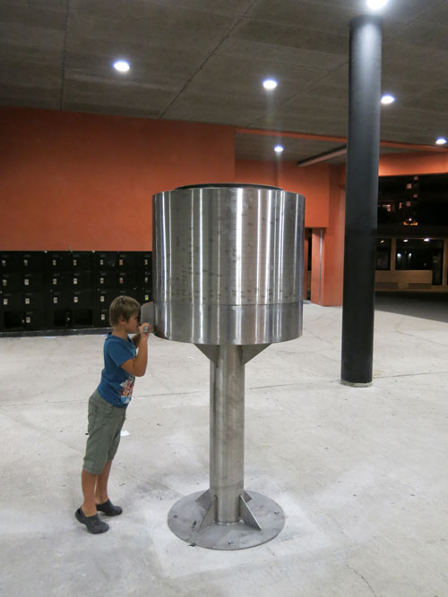 Le principe de ce périscope est de pouvoir parcourir le monde dans toutes les directions à partir du centre du collège défini comme étant le kilomètre 0 et donc le centre du monde.L'idée du kilomètre 0 prend évidemment tout son sens historique et symbolique sur le site du collège qui est bâtie sur le coeur de la ville antique comme en témoigne les restes du théâtre au centre de la cour.