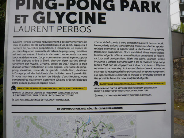 En 2016 Laurent Perbos imagine un espace de jeu unique dans lequel un ensemble de tables de ping-pong revisitées est mis en scène. Sportifs et promeneurs sont amenés à se rencontrer autour de sculptures à jouer. S'amuser des rebonds sur une boucle aérienne avec Loop, commencer un set à plat ventre pour le poursuivre à genoux puis debout autour de Shell, aborder deux parties simultanément sur Puzzle et ne plus rien comprendre aux chassés-croisés qui s'opèrent... Autant de nouvelles façons d'aborder le tennis de table, en duo ou en équipe.