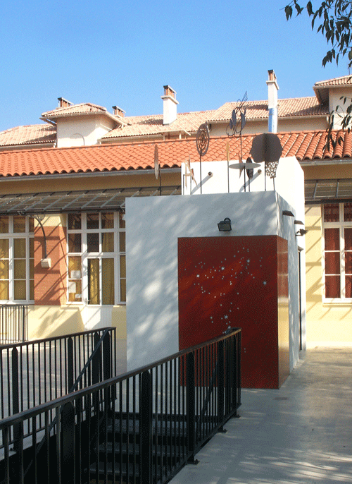 L'oeuvre intitulée Eppure Gira que je propose pour le groupe scolaire Révolution sera installée sur la construction qui abrite l'ascenseur situé entre les deux cours de récréation. Elle est composée de différents éléments.