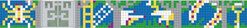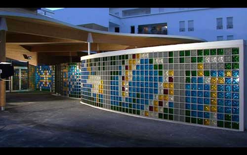 La frontière que constitue le mur de séparation entre les deux cours (maternelle et primaire) est envisagé comme une surface de projection propre à recevoir des interprétations variables. En effet, entre « la cour des grands » et celle des petits, l'écran que constitue un mur est propice aux fictions. Que ce soit projection vers le futur ou retour dans son passé, l'autre côté du mur est toujours fantasmé. C'est souvent le brouhaha sonore qui laisse deviner plus qu'il ne raconte l'existence de cet autre côté, cette autre dimension. Ici, la proposition est de laisser aussi entrevoir ces silhouettes en mouvement que sont les autres, à travers un lexique de formes déclinées en pavés de verre colorés. Le dessin y est construit sur le principe du point de croix. Les motifs y sont simplifiés jusqu'à en être quelquefois des indices plus que des images.