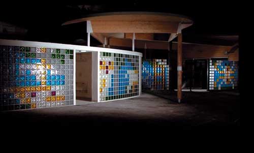 L'aspect translucide qu'offre ce mur/écran en pavés de verre, permet d'animer ces signes et de les appréhender comme un arrière-plan, ou un avant-plan, mis en mouvement par les acteurs même de la cour. Cet effet de transparence redouble encore leur caractère mystérieux, peu enclin à se laisser enfermer dans un sens unique. Ils invitent plus à la déambulation et au jeu (les « cadavre exquis » des surréalistes, par exemple), qu'à une stricte contemplation.