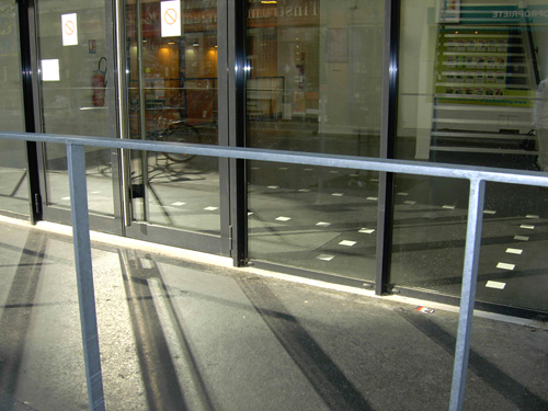 Dans l'oeuvre de Wilson Trouvé, l'agencement des carreaux blancs suggère à la fois les lignes présentes devant les buts d'un terrain de football et les perforations situées sur les bords d'une pellicule cinématographique. L'écart entre ces deux représentations induit un rapport d'échelle mouvant que le spectateur est amené à expérimenter lors de ses déplacements dans le bâtiment.
