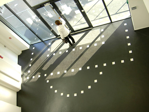 Chape ciment lissée, incrustation de carreaux de grès blanc 10x10cm, revêtement noir résine Trafic Sol 600 et Trafic Sol PU noires