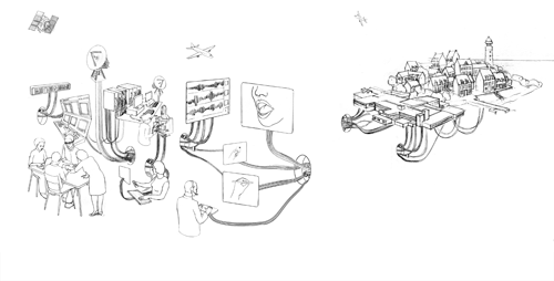 Paroles, images et écritures s'inscrivent dans cette petite « fabrique » qui irrigue l'ensemble de l'image ' et par extension du monde. Si certains des liens sont visibles et matérialisés de façon simple par les groupes de câbles qui traversent l'image, d'autres se déploient de façon invisible, par la voie des ondes, dans l'air ou dans l'eau. Ainsi, ce projet propose une mise en rapport entre deux espaces que l'on pourrait au premier abord considérer comme radicalement opposés. Un petit port à l'architecture vernaculaire ne sera pas spontanément associé à la recherche technologique de pointe. Cependant, aujourd'hui, difficile d'échapper aux avancées techniques dans le domaine de l'information et l'étendue des enseignements dispensés au sein de Télécom Bretagne nous rappelle que cette science est présente de façon extensive dans notre environnement sans pour autant être visible. Par-delà les anticipations futuristes qui nous imaginaient à l'an 2000 dans un environnement robotisé et entièrement remodelé par la technologie que ce soit dans les communications mais aussi l'habitat, les déplacements ou encore la nourriture, force est de constater la permanence de certains éléments de notre cadre de vie. La technologie n'en est pas moins présente, mais elle s'est faite discrète, voire invisible pour la plupart d'entre nous. Ainsi, tel un « think-tank » souterrain fourmillant d'activité, ce groupe fabrique, organise et pense les connexions avec le monde, ainsi que le fait, nichée derrière la pointe du diable, la ruche Télécom Bretagne.