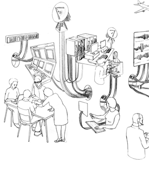 Bien que de plus en plus de communications se transmettent par les ondes, j'ai choisi de conserver beaucoup de cables dans le dessin. Tout d'abord parce que ceux-ci transportent de l'énergie, mais plus spécifiquement parce qu'ils inscrivent visuellement la trace des liens De la même manière, certains outils sembleront obsolètes très vite, s'ils ne le sont déjà. Cette question de la contemporanéité de l'image s'est posée d'emblée comme fondamentale mais aussi insurmontable. Soit le dessin s'inscrivait dans une démarche historique (par exemple avec des outils de communication circa 1979), soit il prenait le parti-pris de l'instantané (la communication en 2009) ou celui de l'anticipation, soit il se construisait dans un rapport flexible avec la temporalité. J'ai choisi cette dernière option tant il me semblait impossible de dessiner des outils absolument contemporains dans la mesure ou la vitesse de transformation des technologies fait qu'un outil à la pointe aujourd'hui sera dépassé dans six mois. Plutôt que d'essayer de prétendre à la modernité via les outils, j'ai préféré réfléchir à la modernité via les postures et les structures et j'ai donc choisi les objets en fonction des rapports qu'ils me permettaient d'installer. Chaque posture est réglée précisemment et chaque outil est choisi pour sa fonction mais aussi pour la spécificité du rapport qu'il engage avec le corps. Si les écrans tactiles deviennent de plus en plus présents dans notre environnement, j'ai néanmoins choisi de conserver beaucoup de claviers pour la raison simple que la vue d'un clavier convoque l'idée que des mains vont se poser dessus. Un écran seul convoque avant tout la vue et il manque à mon sens ce rapport fondamental dans la communication entre la vue, le corps et, bien sûr, le langage. Un clavier c'est des lettres, des chiffres, des signes que les mains effleurent pour combiner des proposition intelligibles, c'est à dire une toute particulière combinaison entre la pensée, le faire et le dire. De la même manière, le tableau de contrôle à gauche de l'écran comporte un levier de commande qui évoque un rapport avec la géographie particulier. On l'empoigne pour se déplacer dans un espace codé, il est le lien dans la transposition géographique entre le réel et sa représentation, l'espace physique et son écriture informatisée. Ce travail sur la représentation qu'installent les technologie de la communication est aussi pointé dans les deux plus grands écrans au centre de l'image. D'un côté la bouche, ouverte, émettrice, figure de la voix, de l'autre, l'oscillogramme, écriture, traduction de cette voix. Entre le sonore et le visuel, j'ai rajouté l'invisible, à savoir les ondes électriques. Cet oscillogramme est celui du courant mesuré dans un récepteur téléphonique lorsque sont proférées les voyelles. Plus que l'enregistrement sonore d'une voix entendue via un téléphone, ces lignes retranscrivent la matérailité même de sa substance, la trace de l'énergie électrique qui la compose et permet son transport. Transports et déplacements animent ce dessin sous différentes manières. Dans le temps, du crayon à la puce électronique mais aussi dans l'espace, de l'ici à l'ailleurs - au-delà de l'atlantique, dans d'autres fuseaux horaires, dans l'espace où naviguent les satellites - et dans les mises en rapport entre l'immobile et le mobile. Le groupe qui borne l'image sur sa gauche constitue un pivot essentiel de l'image. Il rappelle que bien avant toutes les inventions technologiques, la communication est avant tout affaire d'échanges entre humains. Autour d'une table quatre personnes, quatre postures différentes, debout et mobile, assis et concentrés sur des papiers, dans un moment de réflexion et en lien avec un ailleurs via l'écran d'ordinateur. Ancré dans le sol par l'unique pied visible, le pateau de la table propose une surface d'accueil, topos visible de tous les fils de cette trame invisible.