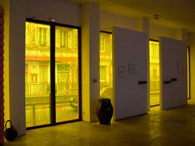 Une palissade à l’aspect très graphique obture totalement les vitrines, conférant immédiatement au lieu une notion d’étrangeté, non sans rapport avec sa programmation et ses activités. L’intérieur du DOJO est baigné de cette lumière donnée par la transparence de l’adhésif.